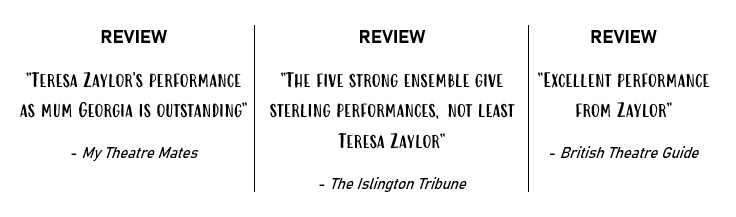 My most recent stage performance as lead character Georgia in Back to Hackney was described as ‘excellent’ by the British Theatre Guide and ‘outstanding’ by My Theatre Mates.